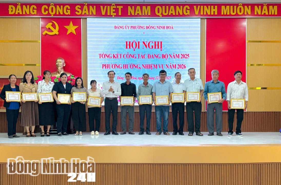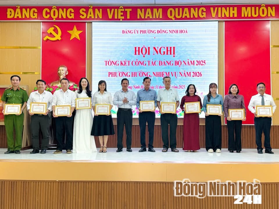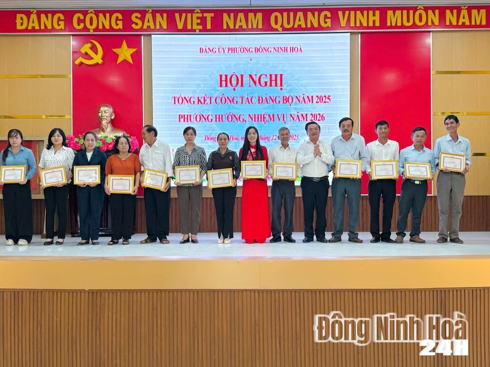Dịp này, Đảng ủy phường Đông Ninh Hòa đã biểu dương, khen thưởng 11 tập thể, 27 cá nhân có thành tích xuất sắc trong công tác xây dựng Đảng năm 2025.