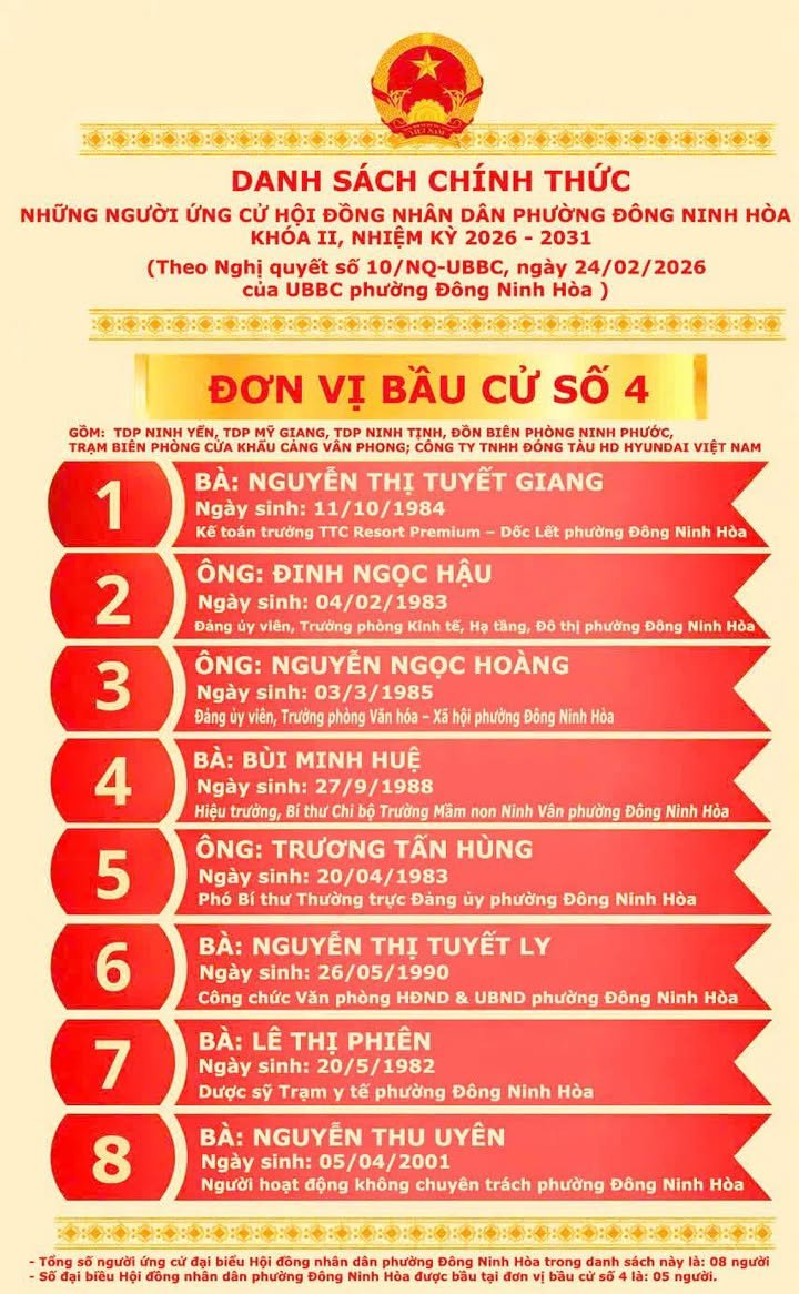 HOÀ KHÓA II, NHIỆM KỲ 2026 - 2031. 🌺 ĐƠN VỊ BẦU CỬ SỐ 04 - Gồm : TDP Ninh Yển, TDP Mỹ Giang, TDP Ninh Tịnh, Đồn Biên...