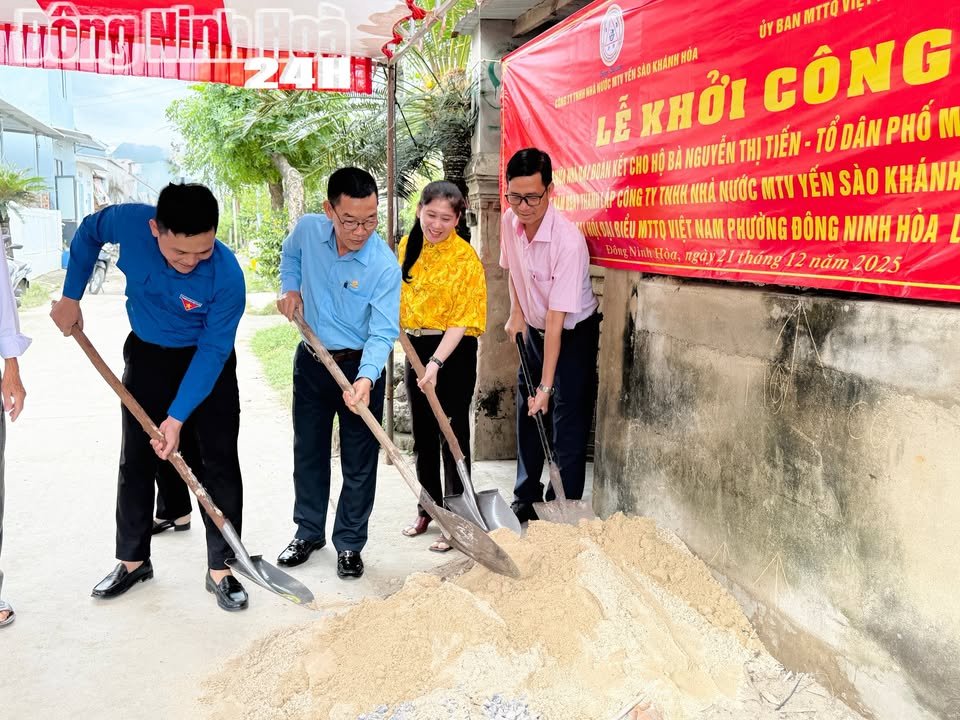 Thực hiện chủ trương của Đảng và Nhà nước về công tác an sinh xã hội, chăm lo cho người nghèo, góp phần thực hiện mục tiêu “không để ai bị bỏ lại phía sau”, sáng ngày 21/12/2025, Ban Thường trực Ủy ban MTTQ Việt Nam phường Đông Ninh Hòa phối hợp với Công ty TNHH Nhà nước MTV Yến sào Khánh Hòa long trọng tổ chức Lễ khởi công xây dựng Nhà Đại đoàn kết cho hộ gia đình bà Nguyễn Thị Tiến, cư trú tại Tổ dân phố Mỹ Á – phường Đông Ninh Hoà